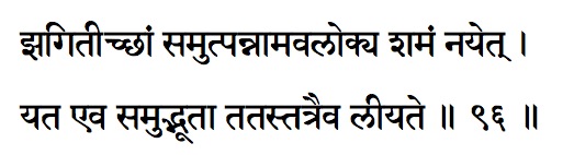 jhagit – a sparkle, flash; ichcham – desire, wish, hankering, longing, craving, urge, will; samutpatati – rise, ascend, spring up; avalokana – observe, glance, view, see; shamam – equanimity, tranquility, to end; nayet – brings, carry; yata eva – verily, wherever; samudbhuta – arising, springing up; tata-tatraiva – there! (put your attention) there!; leyate – become absorbed.