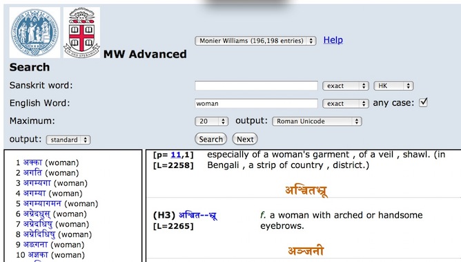 Another useful dictionary that goes both ways is the Spoken Sanskrit dictionary. You can enter an English word and get Sanskrit words, or vice versa.