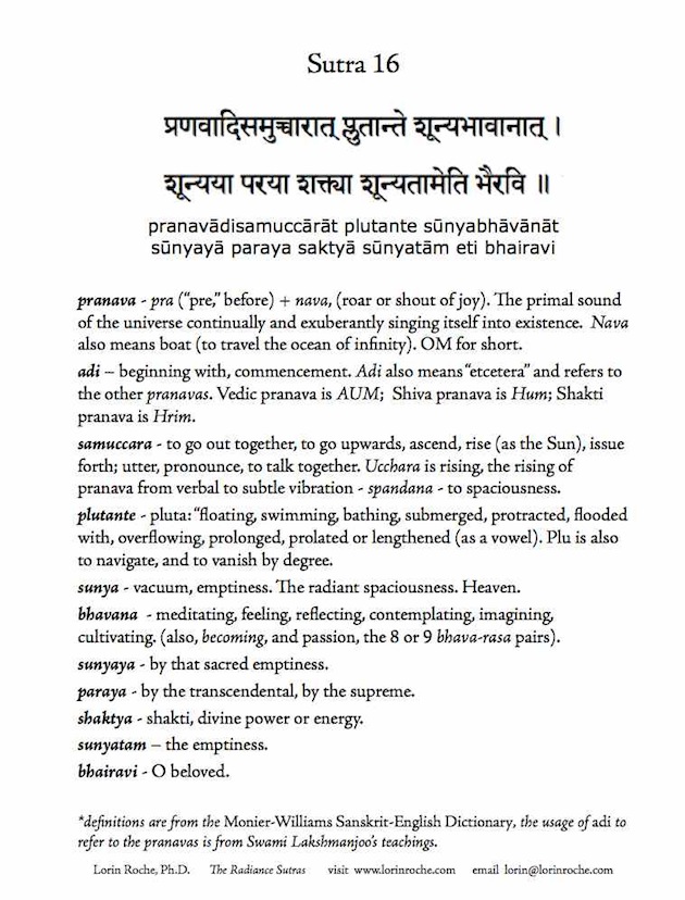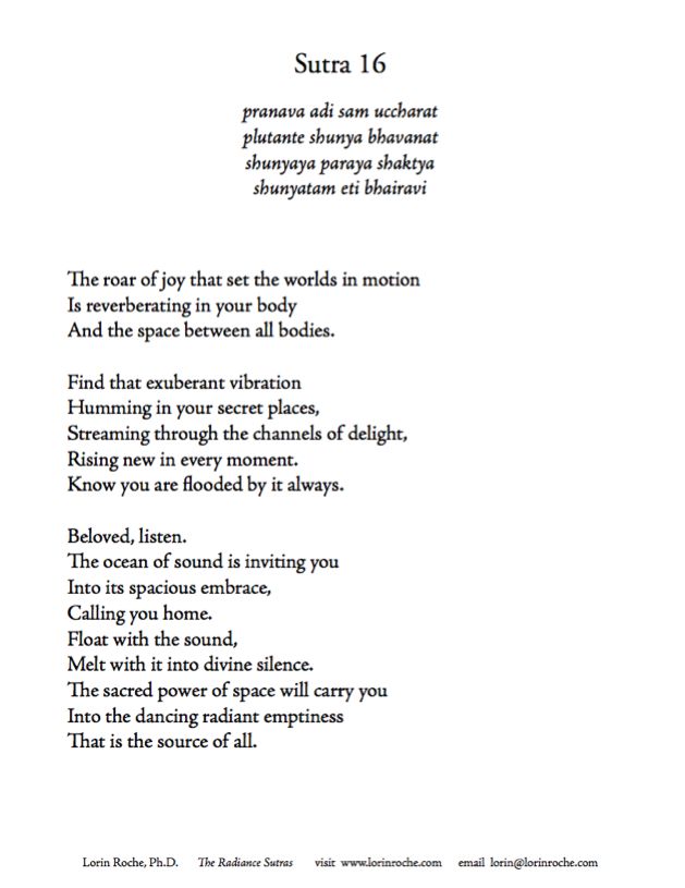 In The Radiance Sutras, Shiva is conversing with his beloved, the Goddess Devi, on the mystery inside pranava. In Sutra 16, Shiva says: