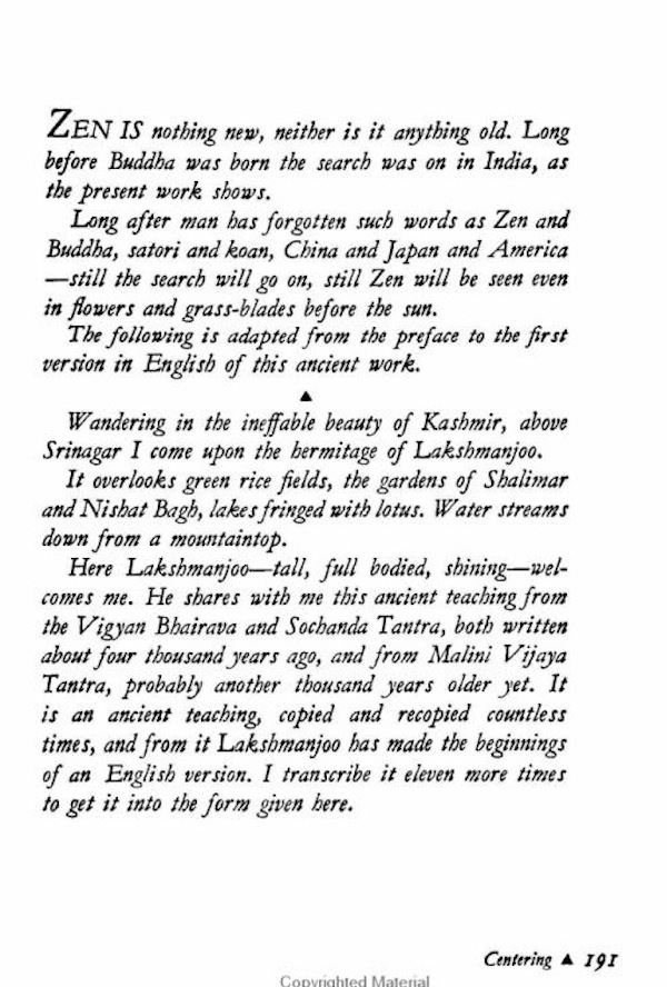 Here Lakshmanjoo - tall, full bodied, shining - welcomes me. He shares with me this ancient teaching from the Vigyan Bhairava and Sochanda Tantra, both written about four thousand years ago, and from Malini Vijaya Tantra, probably another thousand years older yet. It is an ancient teaching, copied and recopied countless times, and from it Lakshmanjoo has made the beginning of an English version. I transcribe it eleven more times to get it into the form given here.