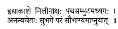 hridayam - heart akasha - space; in the space of the heart nilinaksah - with closed eyes padma - lotus samputa - repetition of a mantra (such as sarva dharman sharanam aham, according to Lakshmanjoo). madhyagah - in the middle padma samputa madhyah = the mantra of the lotus in the middle of the heart chakra. ananya - with no other, without deviation chetah - awareness (citta) subhage - embodiment of good fortune param - highest saubhagyam - spiritual realization apnuyat - achieved